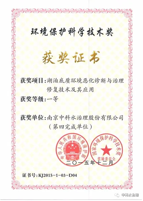2015年,中科水治理技術獲得國家環(huán)保部頒發(fā)的環(huán)境保護科學技術一等獎。