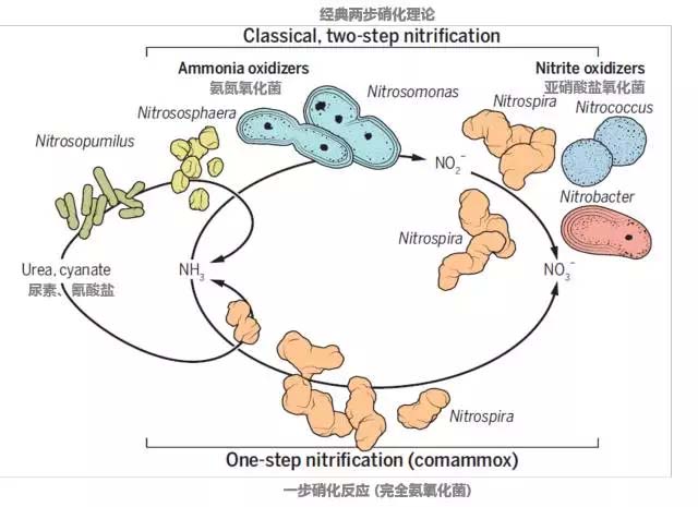 這個理論最先是由俄國微生物界傳奇維諾格拉斯基 (Sergei Winogradsky)早在19世紀末“成功”展示,他分離出了負責這兩步硝化的微生物,也就是所謂的AOB(ammonia oxidizing bacteria)和NOB(nitrite oxidizing bacteria)。但這個超過100年歷史的教條在2015年圣誕節前被英國明星科學雜志《自然》上的兩篇同日發表的題目雷同的文章和隨后一篇在美國微生物學會的文章終結了。三個科學團隊發現了三種不同的培養[1,2]和一種非培養細菌[3]能夠各自進行從氨氮到硝態氮的完全硝化過程。